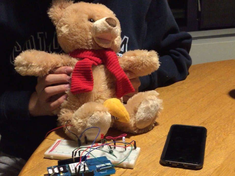 3. When a child hugs “Jeff”, the FSR will trigger the GSM shield to send a pre-composed text message to a hard-coded number (the parent’s number). “Jeff” will then vibrate and with the motors, move its head to signify to the child that he has successfully sent the message of love.